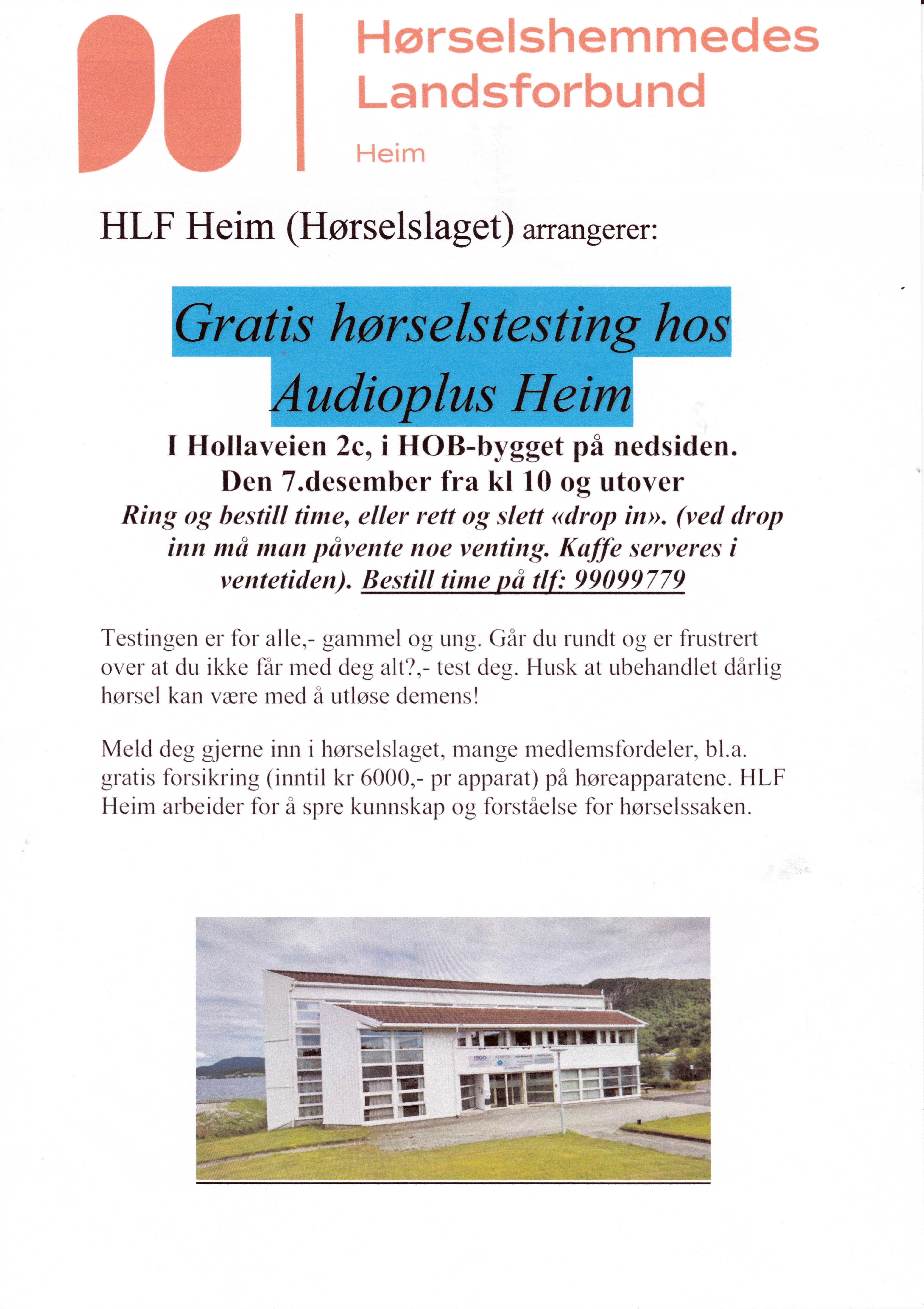 HLF Heim - Hørselshemmedes Landsforening avd. Heim. HLF Skal arbeide for at hørselshemmede, ung eller gammel, skal få bedre livskvalitet, gjøres mest mulig selvhjulpne, og oppnår full likestilling og deltakelse i alle livets sammenhenger. Lokalt har HLF Heim bl.a. arbeidet for at vi skal ha en audiograf i bygda, og gjerne med refusjonsrett.