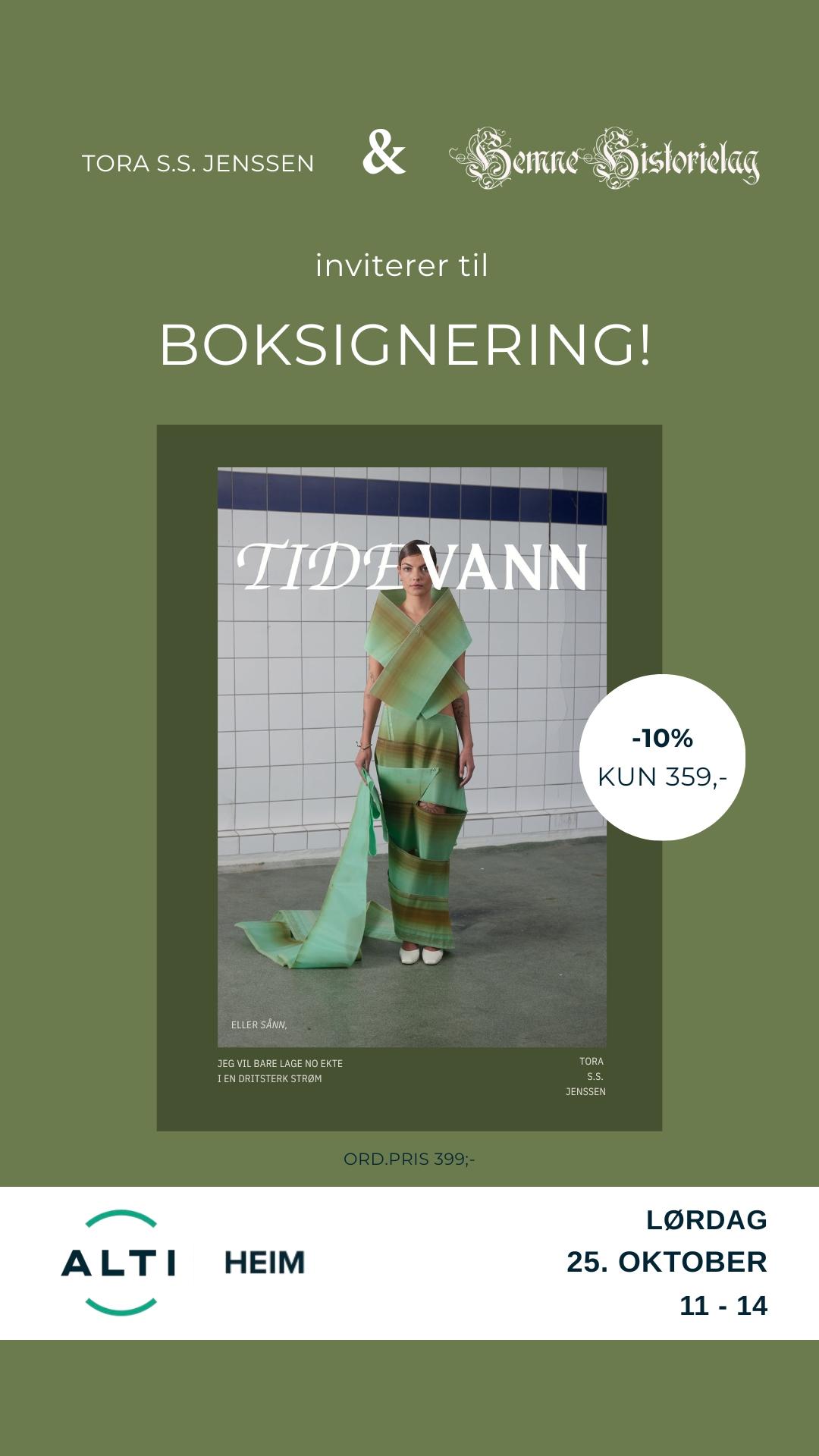 Tora S.S. Jenssen utgir nå boka "Tidevann"!Tora S.S. Jenssen med røtter fra Kyrksæterøra inviterer sammen med Hemne historielag til boksignering av hennes utgivelse Tidevann.