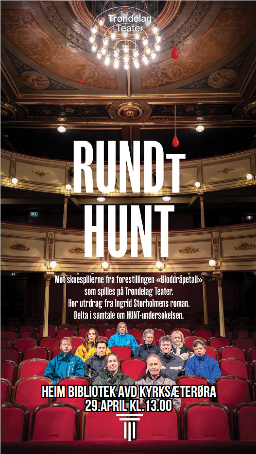 Høytlesning og samtaler med skuespillere fra forestillingen "Bloddråpetall"I boken Bloddråpetall tar forfatter Ingrid Storholmen utgangspunkt i den store nordtrønderske helseundersøkelsen, HUNT, og lar vitenskapen møte poesien.
