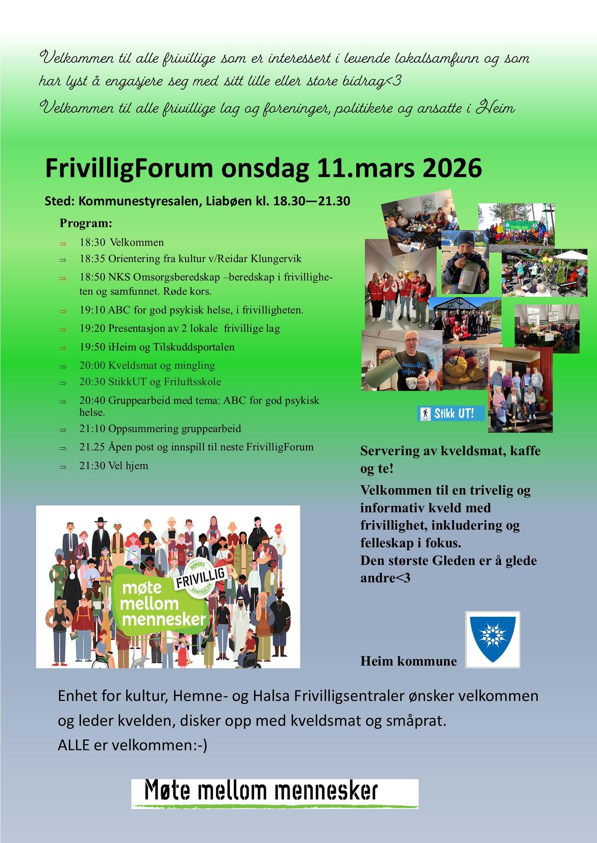 FrivilligForum er et åpent møte for alle som er interessert i levende lokalsamfunn og som har lyst å engasjere seg med sitt lille eller store bidrag. Frivillige lag og foreninger, frivillige forøvrig, tjenestemottakere, politikere, administrasjon i kommunen og alle er velkommen. Meld fra på 90242585 slik at vi får beregne kveldsmat til alle.