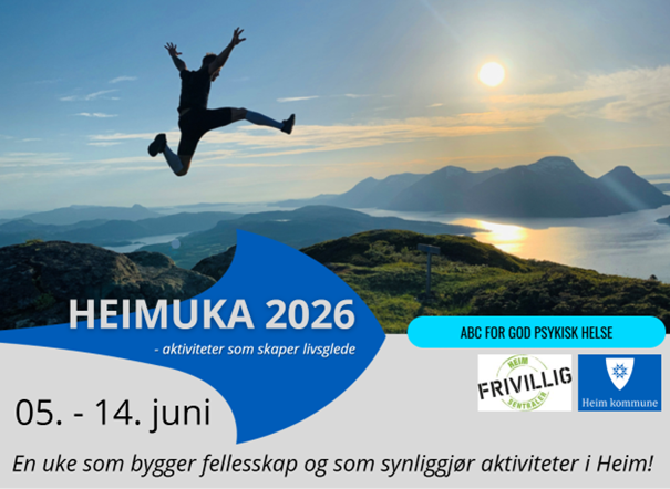 HeimUka kommer fort, den starter med Humorfestivalen på Kyrksæterøra helga 5-7.juni. Med mange små og store arrangement ønsker vi å vise fram frivilligheten på sitt beste vis i hele Heim. I avslutningshelga vil det blant annet bli sommerfest i Liabøparken (ved Frivilligsentralen/Villa Viungen og Tjenestetorget), med gratis konserter og avslutning med Anders Jektvik på sena. Vi håper mange vil delta både med arrangement rundt omkring og ikke minst delta på arrangementene. Meld inn til en av Frivilligsentralene om dine arrangement, om du ikke legger inn selv på iHeim.